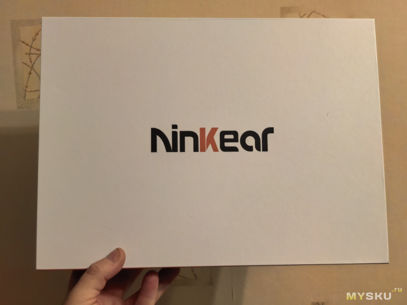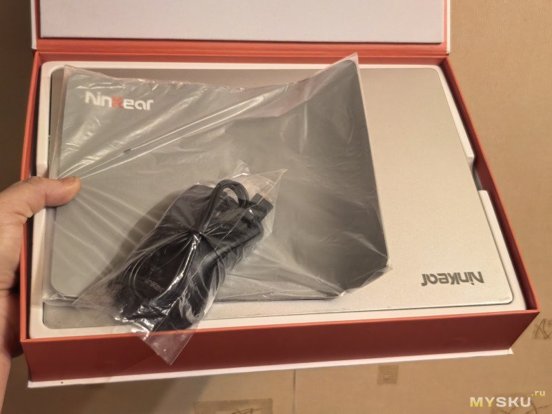 Ноутбук обернут в пакет. На фотографии ниже показал его без пакета. Во-вторых, все разложено красиво, ровно и напоминает качественные бренды. В прошлом у Ninkear упаковка была много проще. Как мне кажется, суммарная стоимость подарков по ценам для частных покупателей не превышает $4, а для бренда она должна быть еще ниже, поэтому подарки в виде проводной мышки и коврика для нее не сильно нужные. Коврик с логотипом Ninkear еще куда ни шло, но мышка — это печаль. Хотелось бы, как в других странах, в которых, видел, в подарок дают сумку для переноса с логотипом. В РФ в этом плане подарки проще.