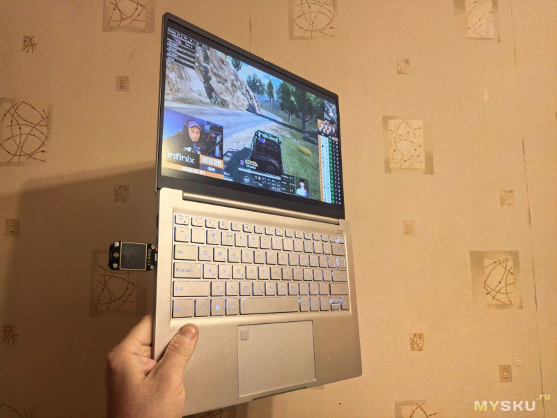 С левой стороны — USB-A 3.0, USB-C для передачи данных и совмещенный микрофон с наушниками 3,5 мм. Для мобильного ноутбука набор нормальный. Дополнительные порты можно получить при подключении хаба.