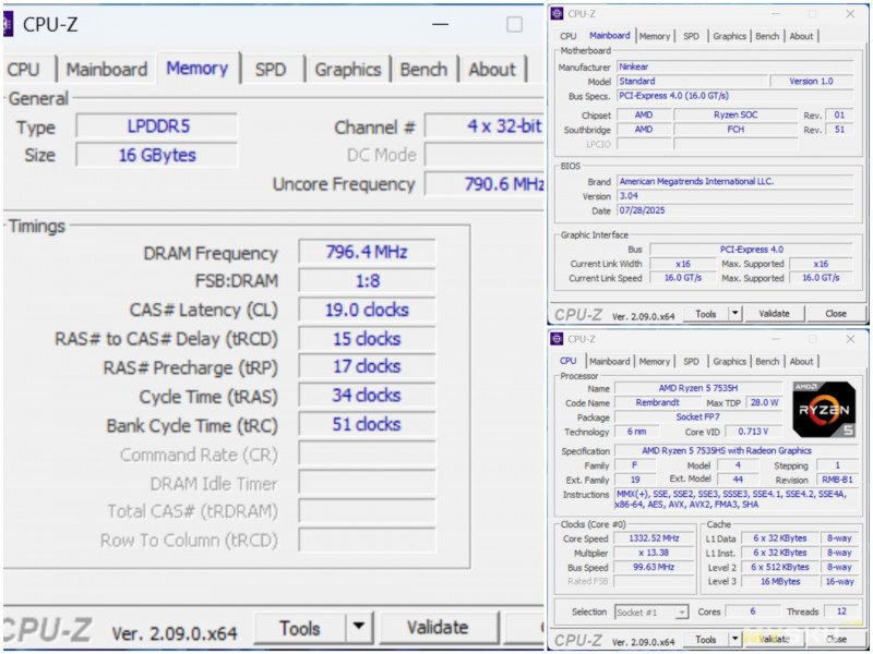 Общая характеристика системы сведена на коллаже ниже. Архитектура процессора Zen3+, повышенный теплопакет (на коллаже в программе значится цифра в 28W) относительно процессора у Chuwi (15W). Более быстрая оперативная память LPDDR5, распаянная на плате. Слот по SSD один, дополнительного нет. Версия Bluetooth 6.0, Wi-Fi 5.4 — современные протоколы.