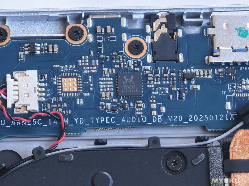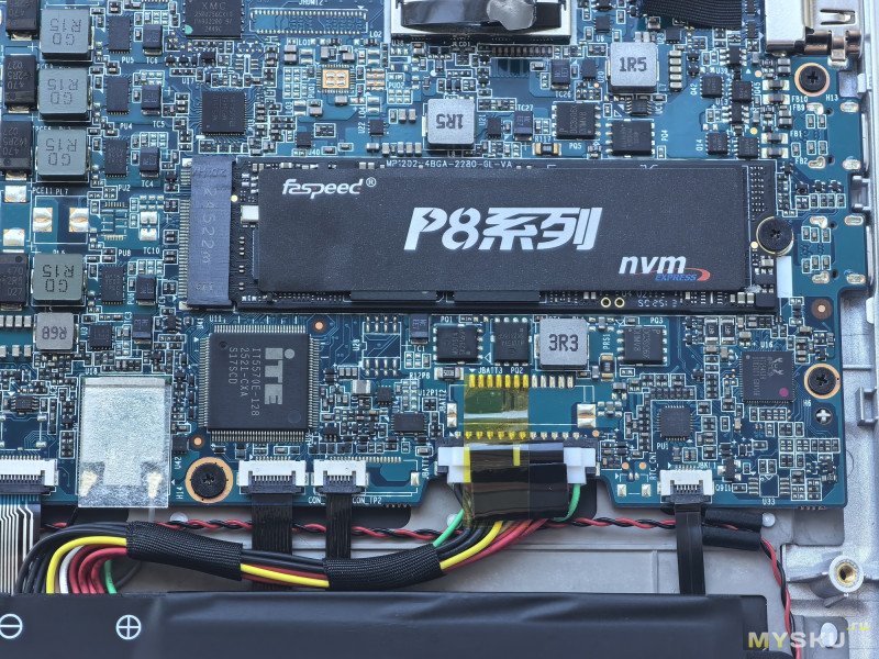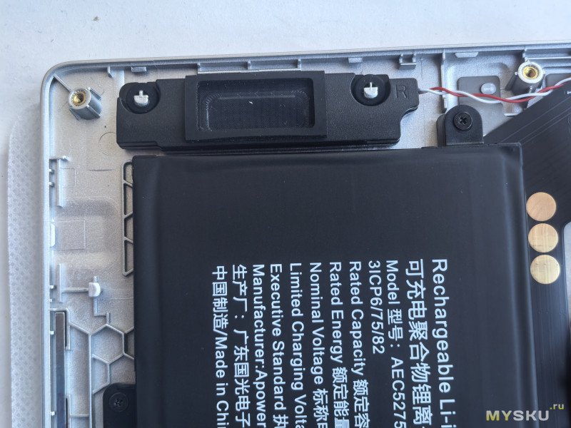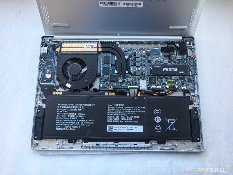 Внутренний мир Ninkear S14 разделен на две большие части, на плату и аккумулятор ёмкостью 60Wh. Его хватает на 8 ч экрана, как заявлено в характеристиках. YouTube проигрывает в течение 6 ч. Для лёгкого ноутбука это хорошие показатели.