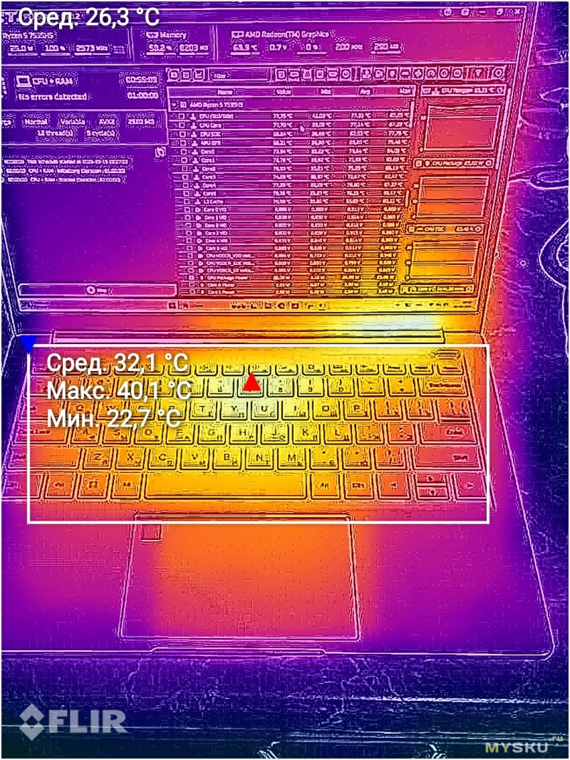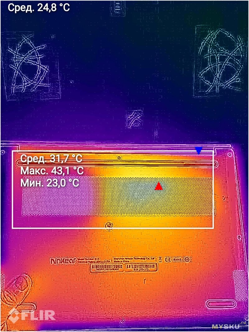 По результатам одночасового теста в OCCT, нагрев на клавиатуре в среднем составил 32⁰С, максимально было 40⁰С. С обратной стороны цифры нагрева были сравнимыми. Внутри стоит один кулер с двумя теплоотводящими трубками. Система справляется с заявленными 25W TPD.