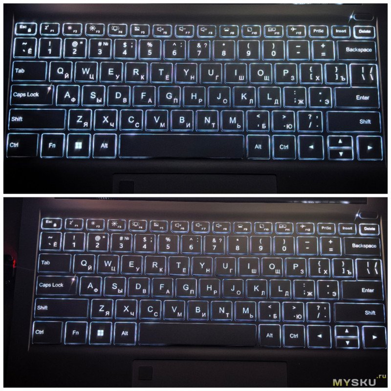 Клавиатура у товара подсвечивается в двух режимах. Нанесены латинские символы и кириллица в тон друг другу. Подсветка идет не только по периметру клавиш, но и сами символы тоже. Ход клавиш привычный, в 1 мм.