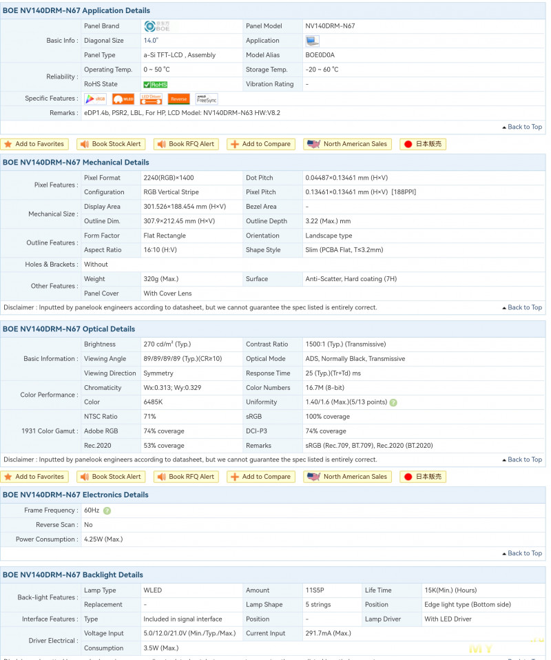 С сайта panelook.com привел данные по ней. Отдельно такая матрица стоит от 7000 руб. примерно ($80-120, что видел).