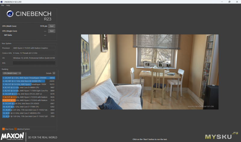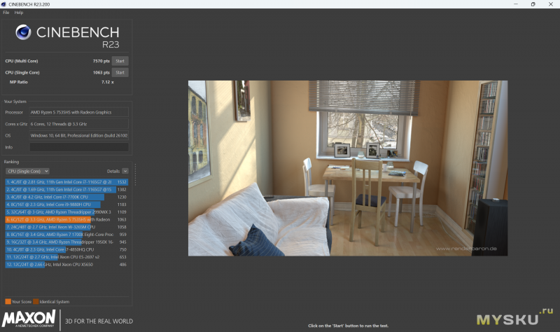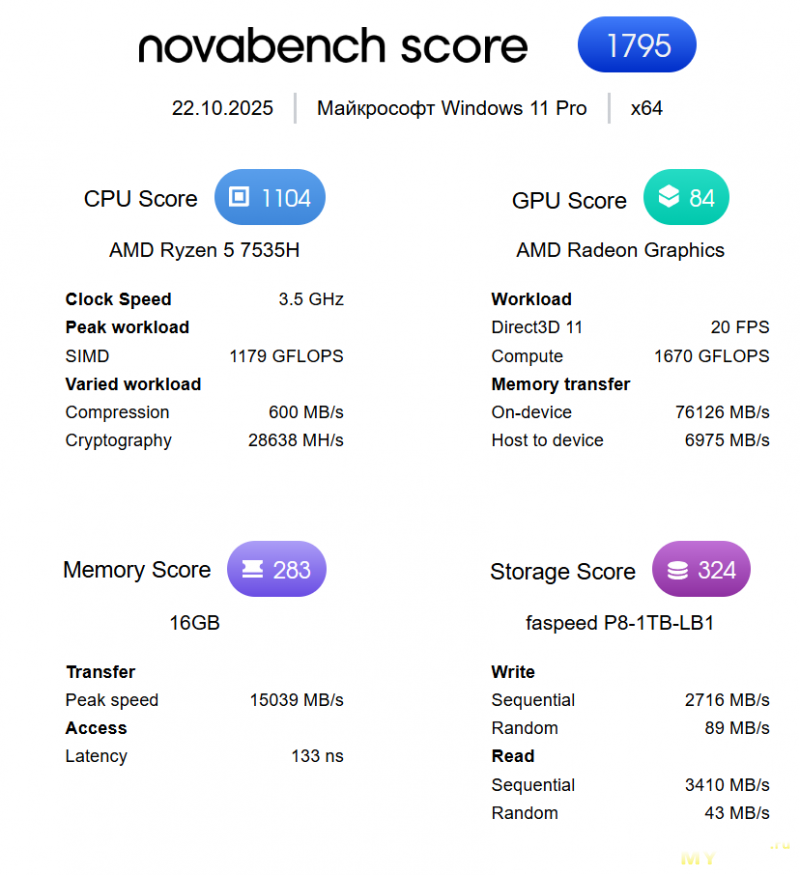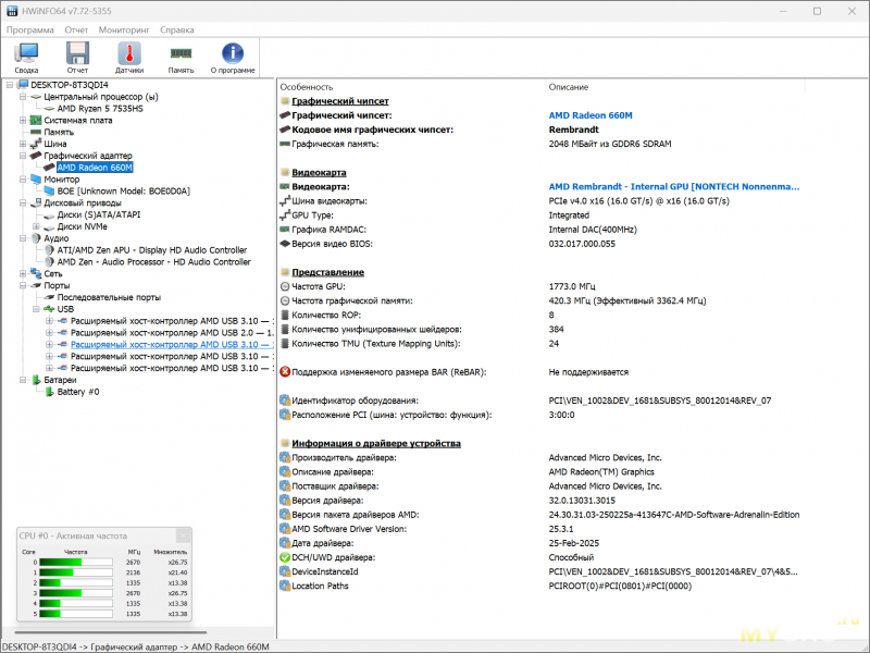 - Процессор: AMD Ryzen 5 7535HS, частота от 3,3ГГц до 4,55ГГц (архитектура Rembrandt-R, 6 нм)