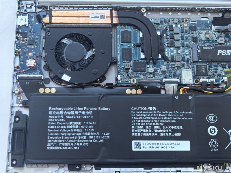 На следующей фотографии видны цифры по емкости аккумулятора и вентилятор с трубками охлаждения. Последняя система не отличает от той, что есть у Chuwi CoreBook X или Ninkear A15 Pro (обзор здесь).