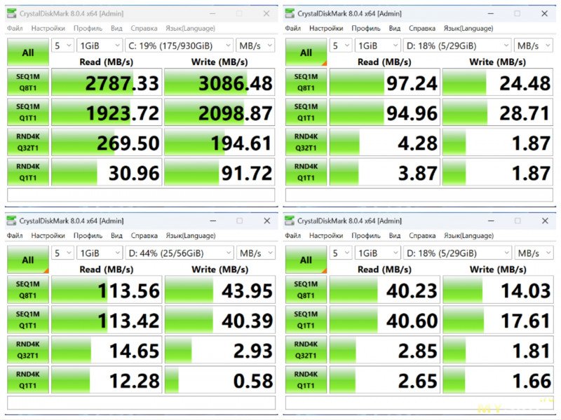 Информацию по скорости работы интерфейсов свел в коллаж. Справа налево в нем показаны данные по SSD, USB-C 3.2 Gen2, USB-A 3.0 и USB-C 2.0 (только данные). Скорости не запредельные. К примеру, ожидал от USB-C 3.2 Gen2 больше. Проверял ее с помощью флешки с такими же заявленными характеристиками.