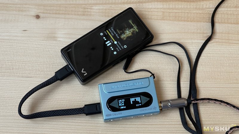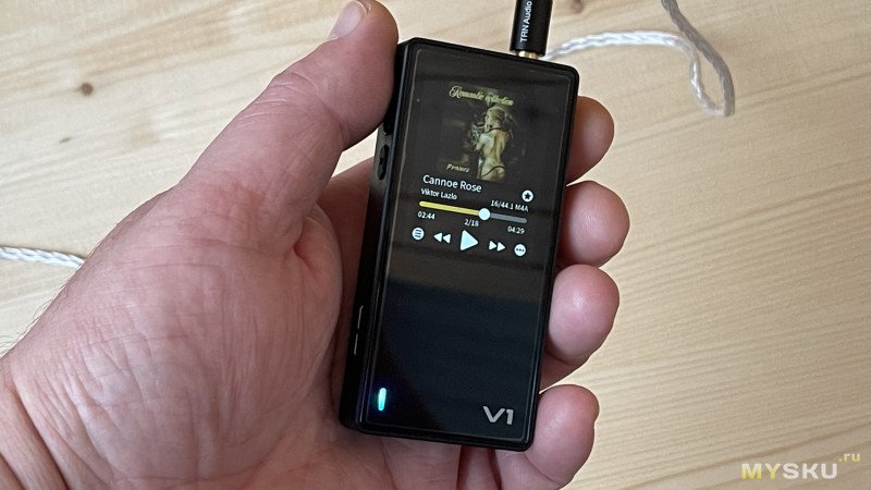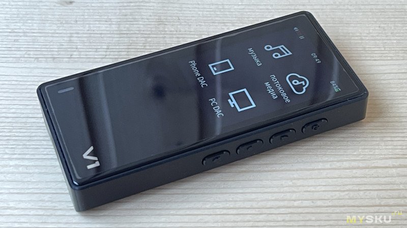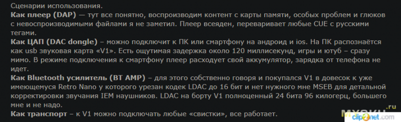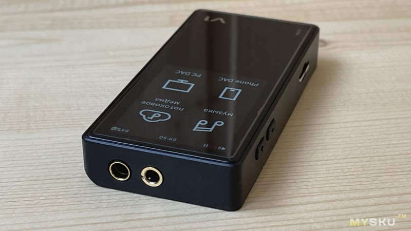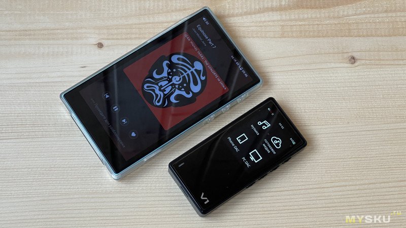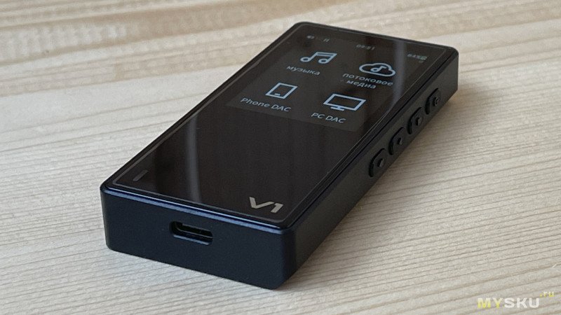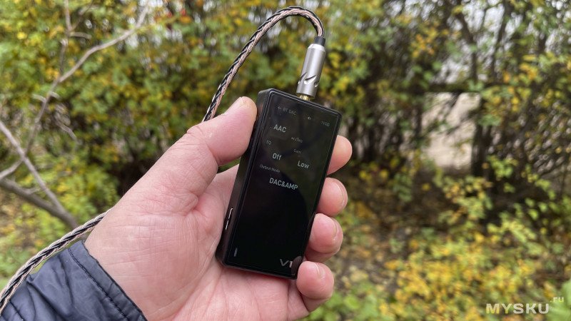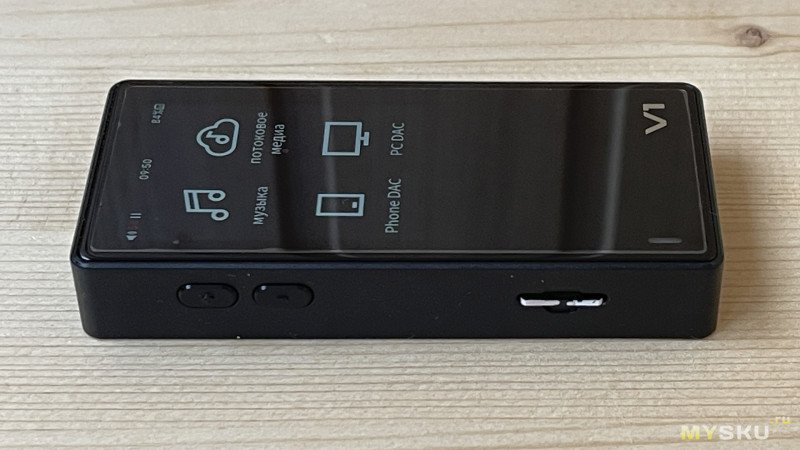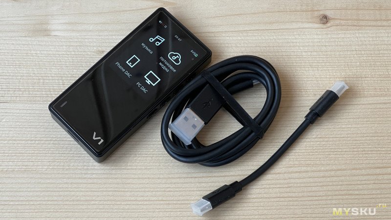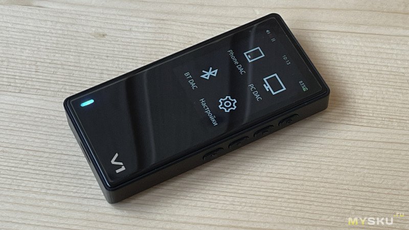 Как ЦАП (DAC dongle) – можно подключит к ПК или смартфону на андроид и ios. На ПК распознаётся как usb звуковая карта «V1». Есть ощутимая задержка около 120 миллисекунд, игры и ютуб – сразу мимо. В режиме подключения к смартфону плеер расходует свой аккумулятор, зарядка от телефона не идет.