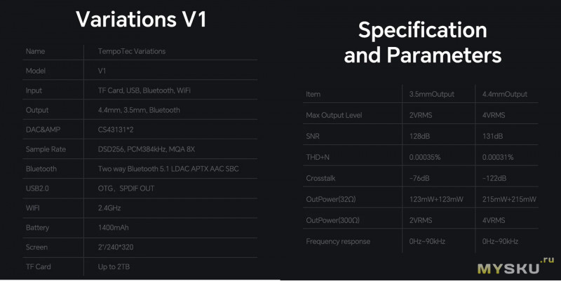 TempoTec Variations V1 имеет на борту два цап с токовым буфером (интегрированным усилителем для наушников) Cirrus Logic CS43131. В отличие от сотен поделок с такими же цап, V1 имеет нейтральную подачу и нейтральную тональность.Бас тугой и объёмный, нет никакого свеса в звуке, но он не слишком быстрый, сказывается отсутствие полноценного ОУ на выходе.