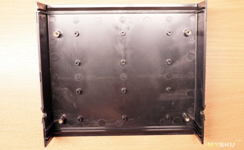 Стоит учесть, что дно тут — обычный и довольно тонкий пластик. Нет никаких дополнительных рёбер жесткости и если планируется ставить массивные детали, типа трансформатора с весом больше килограмма-двух, то нужно продумать усиления. В остальном, после сборки получается довольно простая и надёжная конструкция.