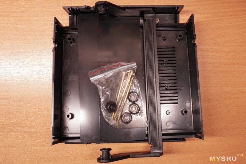 В комплекте были, собственно, детали корпуса: верхняя и нижняя половина, передняя и задняя стенки и ручка. Ещё пластиковые ножки и болты м4х70, для скрепления верха с низом и ножками «насквозь». В верхней части — крышке, для этого предусмотрены пластиковые цилиндрические крепления с закладными деталями с резьбой, а в нижней — сквозные отверстия. И не забыли в комплект положить четыре мелких самореза для крепления плат к соответствующим цилиндрическим креплениям на дне и на крышке.