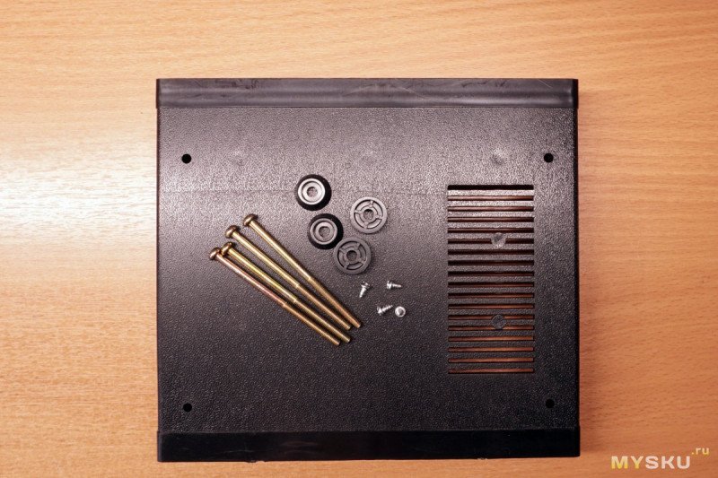 Поскольку доставка из Китая, ехала посылка около месяца, упаковка не особо надежная — в основном пупырка и скотч. Но сам корпус это испытание перенёс стойко, это уже плюс к его надежности ;)В комплекте были, собственно, детали корпуса: верхняя и нижняя половина, передняя и задняя стенки и ручка. Ещё пластиковые ножки и болты м4х70, для скрепления верха с низом и ножками «насквозь». В верхней части — крышке, для этого предусмотрены пластиковые цилиндрические крепления с закладными деталями с резьбой, а в нижней — сквозные отверстия. И не забыли в комплект положить четыре мелких самореза для крепления плат к соответствующим цилиндрическим креплениям на дне и на крышке.