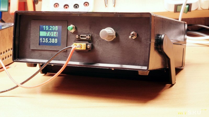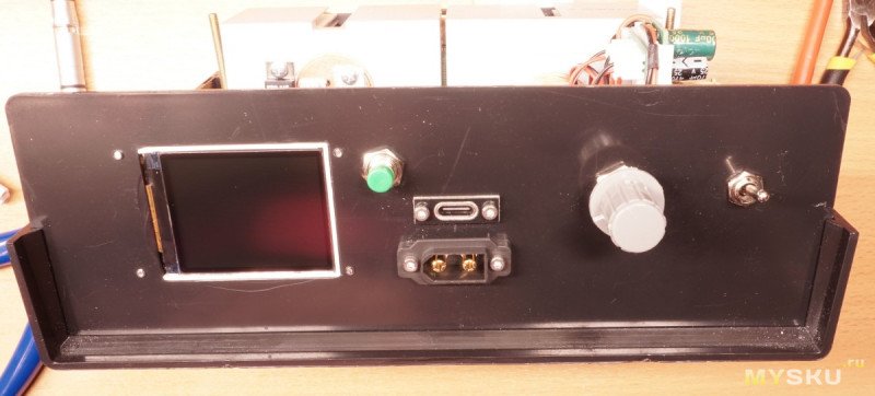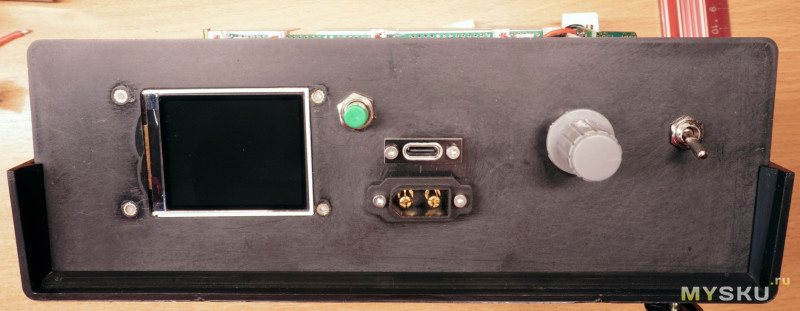 Кроме-того ESP32-C3 позволит в перспективе поставить энкодер для установки значения ограничения тока нагрузки до её подключения, добавить включение и защитное отключение нагрузки при превышении током критического значения. Ну и вообще: простор для творчества, программно можно очень существенно повысить функциональность простой нагрузки. Для питания микроконтроллера и индикатора дополнительный стабилизатор 5В. Выпилил окошко для экранчика и установил его. На передней панели, помимо дисплея, разместил многооборотный потенциометр для управления током нагрузки. Там же разместил и тумблер включения сети. А для подключения тестируемых схем к самой нагрузке, добавил актуальные для меня разъемы XT-60 и USB-C в параллель. От универсальных винтовых-зажимных клемм, подумав, всё же решил отказаться: у меня сценарии их использования слишком редкие и мне проще тогда припаять проводки к соответствующему разъему.