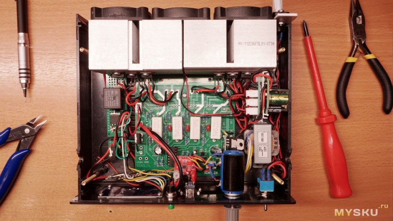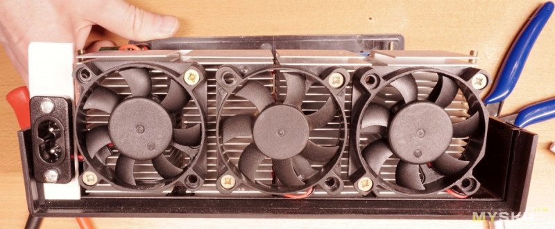 Прикрепил и подключил кулеры к отдельному импульсному БП 12В, через термореле 55 градусов. Дуют они так себе, но в данном случае и с этими радиаторами, трёх таких хватает удерживать температуру до ~70-110Вт (Включаются после ~60Вт). Осталось ещё место и для небольшого сетевого трансформатора 12В, 2Вт для питания схемы нагрузки. У него две вторичные обмотки, разница в напряжении на Х.Х. меньше 0.1В, поэтому просто включил их в параллель. Замерял с двумя соединенными выводами разных обмоток — для определения как их соединить параллельно, а не последовательно. Ну и для определения разницы напряжения на Х.Х.