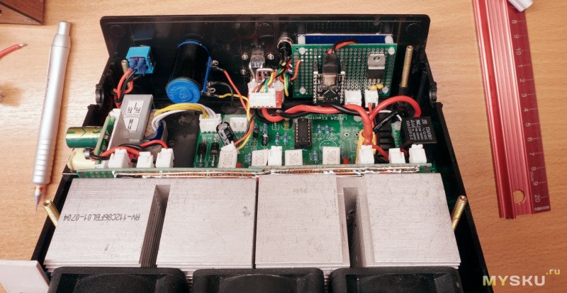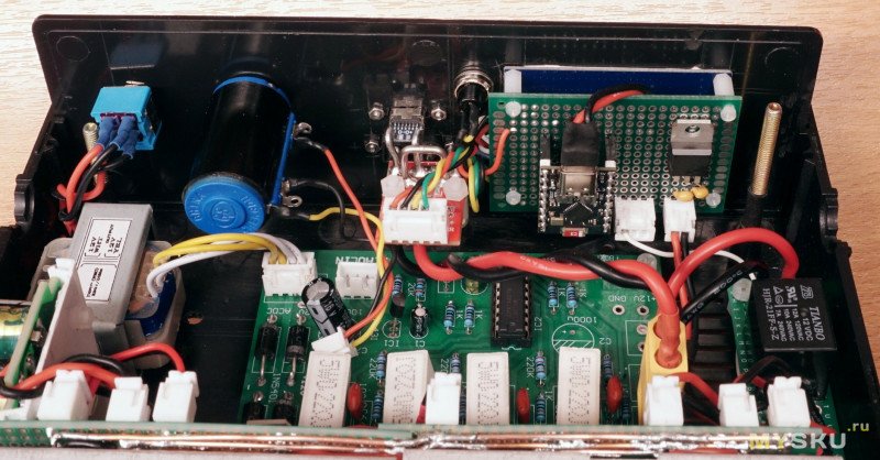После такого «рефакторинга», добился возможности снимать переднюю панель при разборках для доработок и получил относительно простой доступ к основной плате. И хотя у меня при сборке и тестировании проблем с нагрузкой не было, на всякий случай «полечил» и известные «болячки» этой нагрузки, о которых узнал и тут на муське и на форумах. Заменил резисторы шунтов для повышения термостабильности, добавил конденсаторы 0.1 мкФ для устранения самовозбуждения и поставил стабилизатор 7812 на питание ОУ.