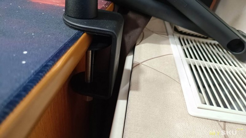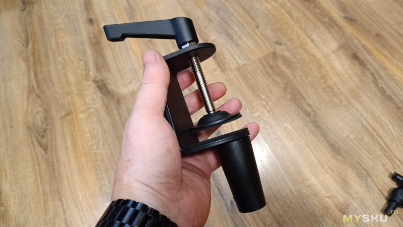 За крепление микрофонной стойки к поверхности стола отвечает зажим в виде струбцины. Это классический C-образный винтовой зажим.