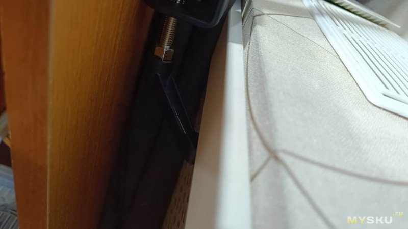 А вот дальше возникли трудности. Мой стол вплотную стоит к стене той стороной, на которую я хотел установить пантограф. Длинная рукоятка струбцины не может провернуться в таких стеснённых условиях. Как же закрепить зажим?