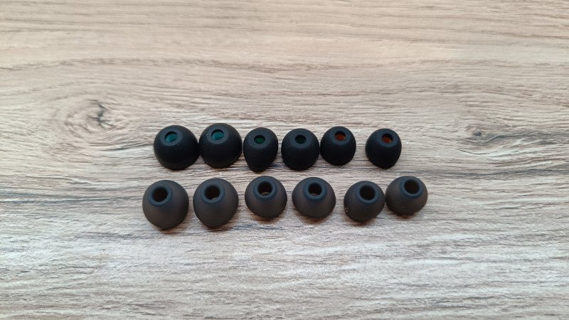 В комплекте целый набор сменных амбушюр. И если на самих наушниках они из «пенки», то в пакете сразу 6 пар силиконовых. Отличаются внутренним кольцом и толщиной юбки. Чтобы установить на звуковод придется применить усилие.