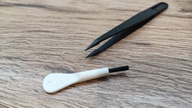 Под оболочкой картонная коробка. А вот в ней уже есть все необходимое. К примеру, пластиковый пинцет и щеточка для ухода за наушниками. Встречаю впервые. Они потребуются для ухода за наушниками и возможно при смене запасной сеточки на звуководе.