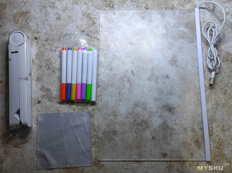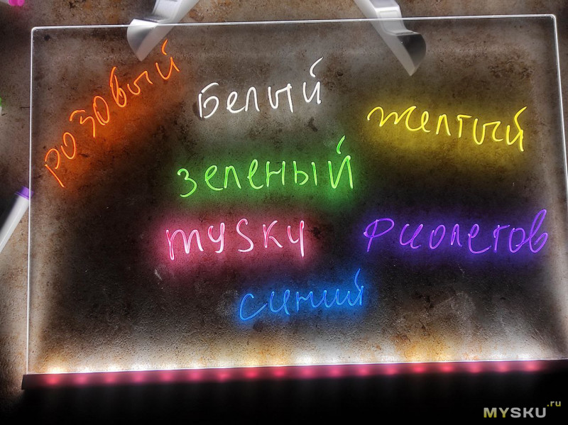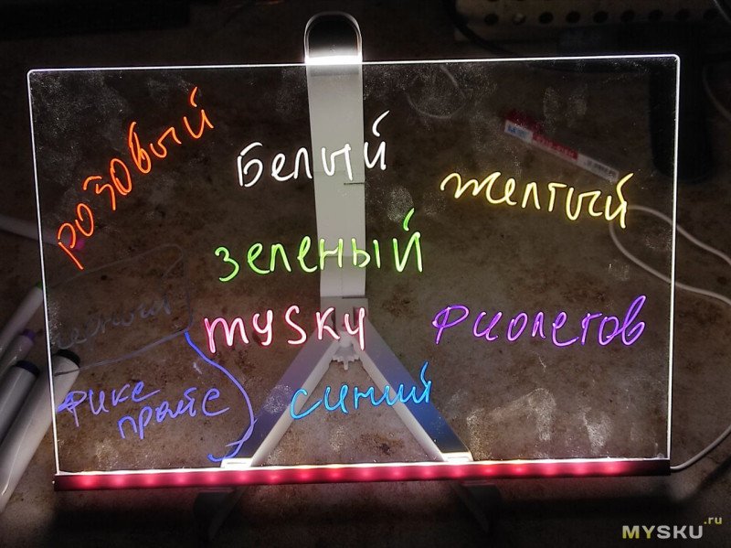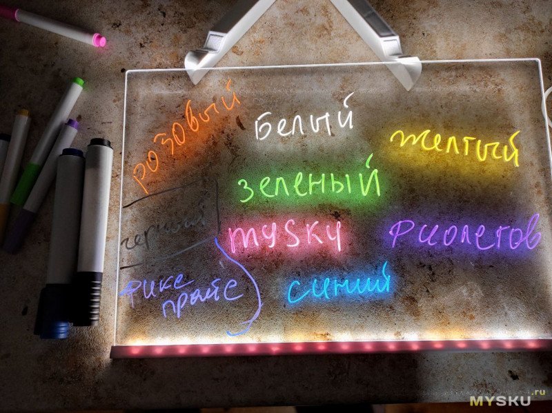 Фломастеры шли в комплекте. В обзоре я пробовал фломастеры для белой достки из фикспрайса — синий светится почти как комплектные фломастеры. То есть нужны фломастеры на водной основе, при этом лучше брать светлые цвета. В комплекте есть даже белый.