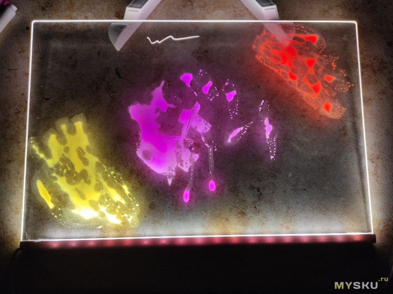 Попробовал рисовать на оргстекле гуашью — ожидаемо ложится плохо, скатывается. Логично, краске некуда впитываться. Но все равно она светится. И заметно, что та часть, которая высохла, светится хуже, а мокрая краска светится ярче.