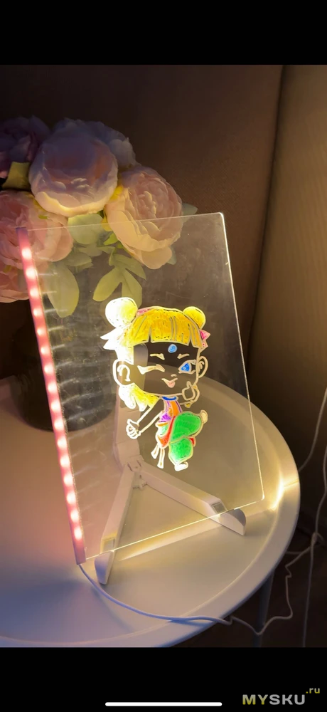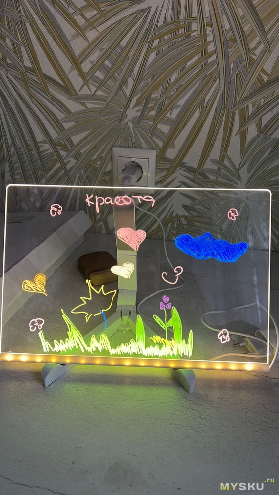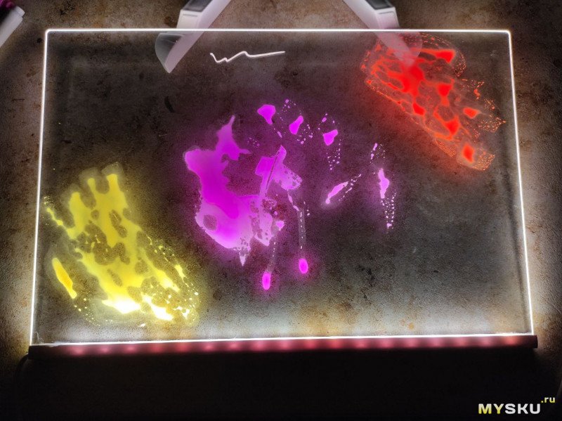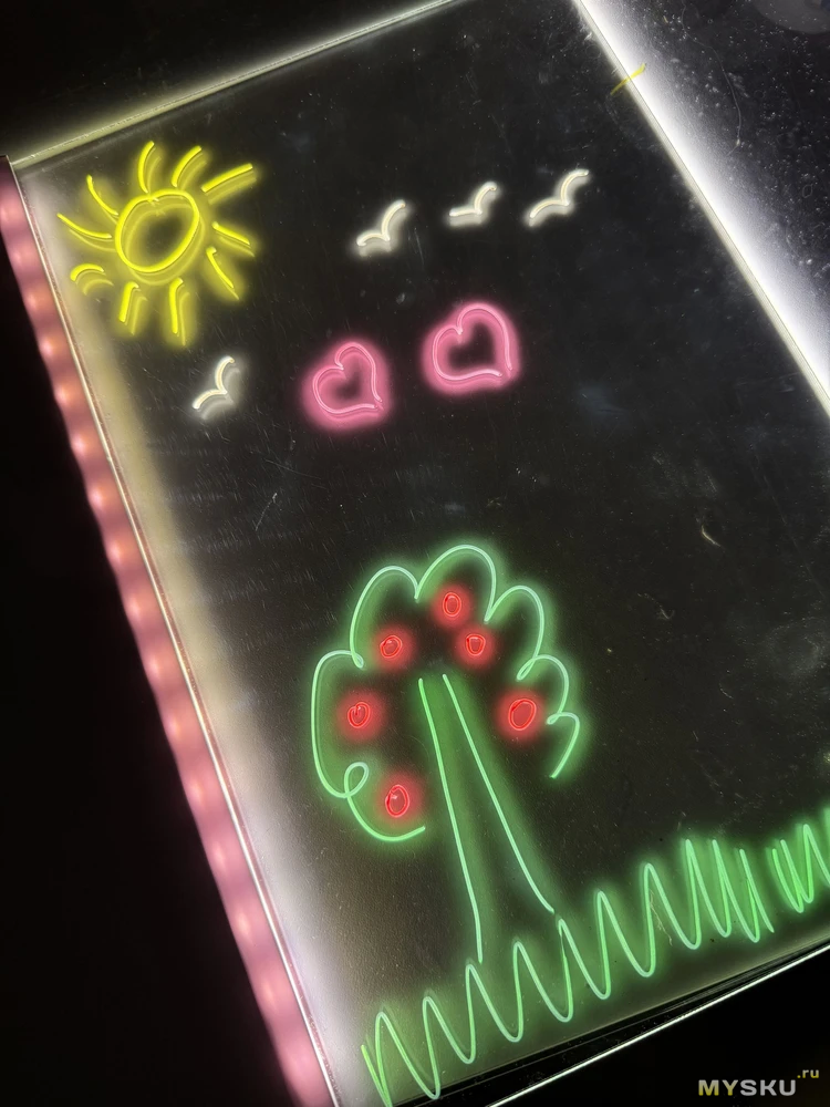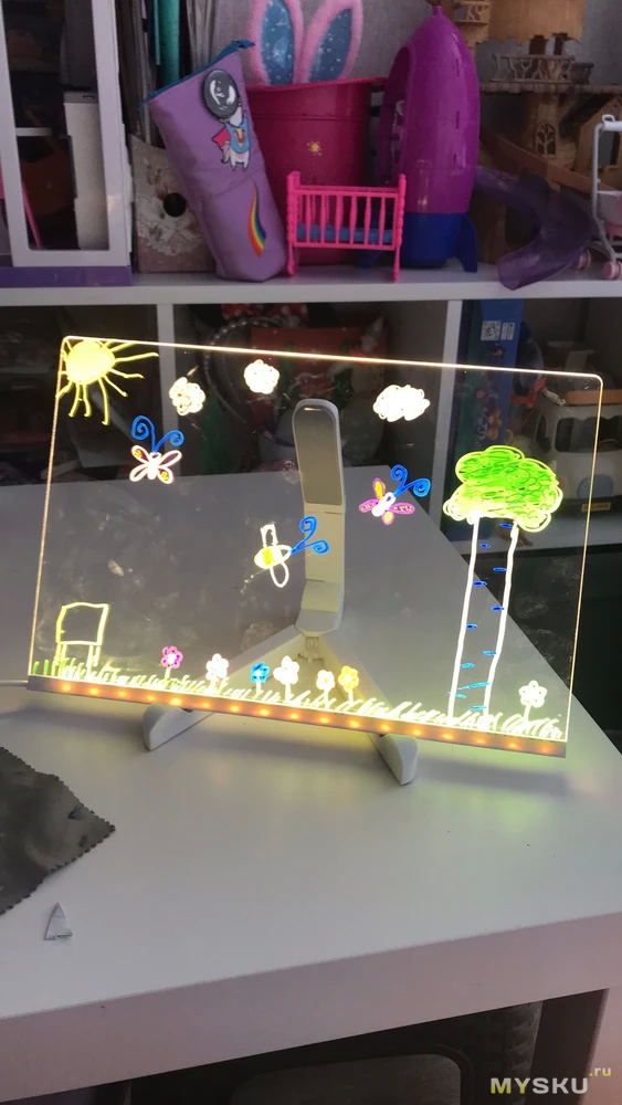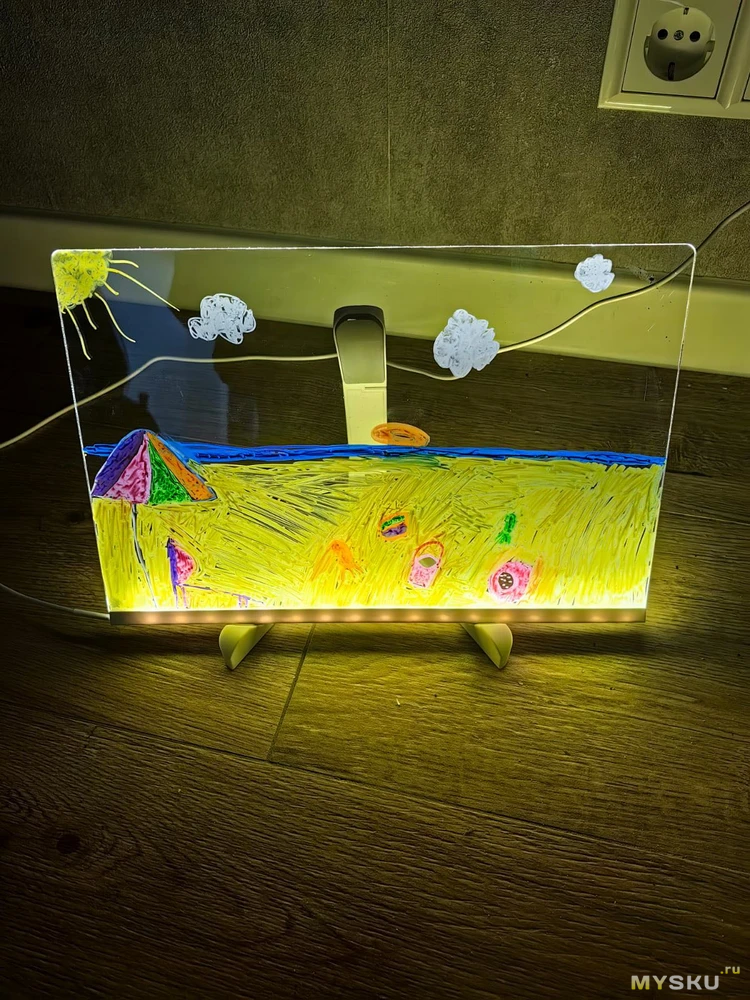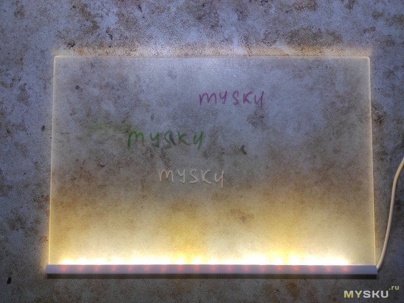 Итог — если меня эта штука удивила, то скорее всего удивит и сына и на какое-то время оттянет его от планшета с майнкрафтом. Можно подложить картинку под оргстекло и перерисовать ее цветнымим маркерами. Можно написать расписание или список дел и он будет светиться. Можно использовать как ночник, все же он выдает 1.7 ватта света — более чем достаточно для ночника. Заказал себе тоже.
