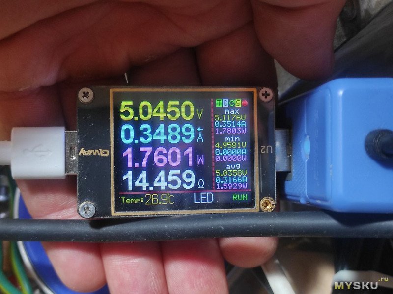 Потребление примерно 0,3А и мощность почти 2 ватта.