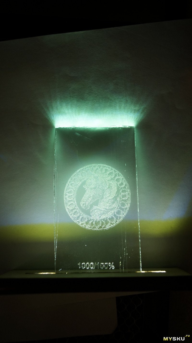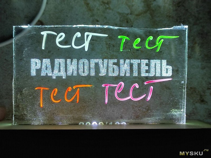 Пример — кусок обычного 3мм оконного стекла, на котором есть гравировка из прошлого моего обзора про лазерный гравер. Снизу он подсвечивается светодиодной лентой, маркеры на нем светятся.