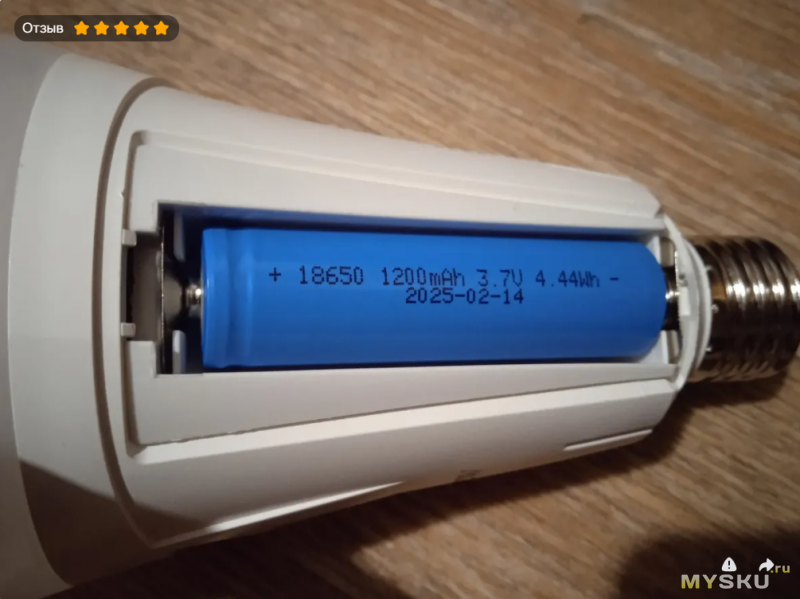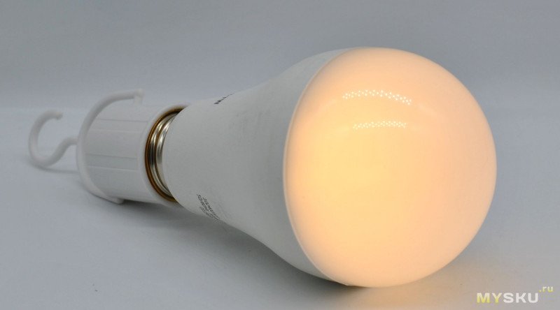 Режим работы один. Внутри аккумулятор 800 мАч, он заряжается когда лампа ввернута в сетевой патрон (в люстру или настольную лампу). Но заряжается долго — 6 часов и нет никакого индикатора.Светит при замыкании цоколя пальцами, кстати: