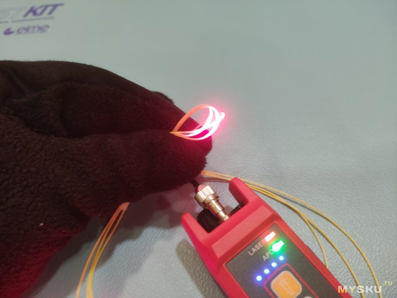 Для демонстрации работы я взял пигтейл.При сгибании кабеля он начинает светиться — это используется для поиска кабеля в пучке.