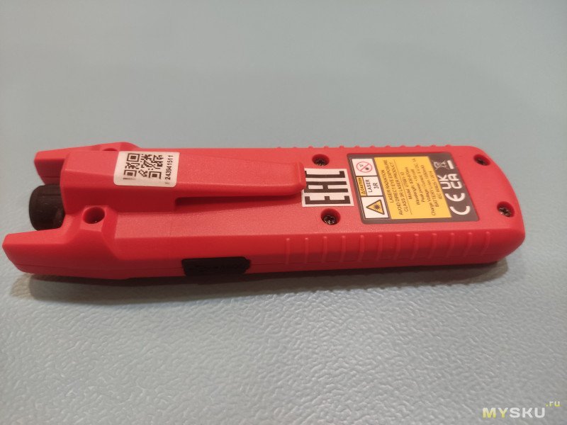 Имеет 2 кнопки — включение лазера и обычного фонарика, 4 точки — индикатор заряда