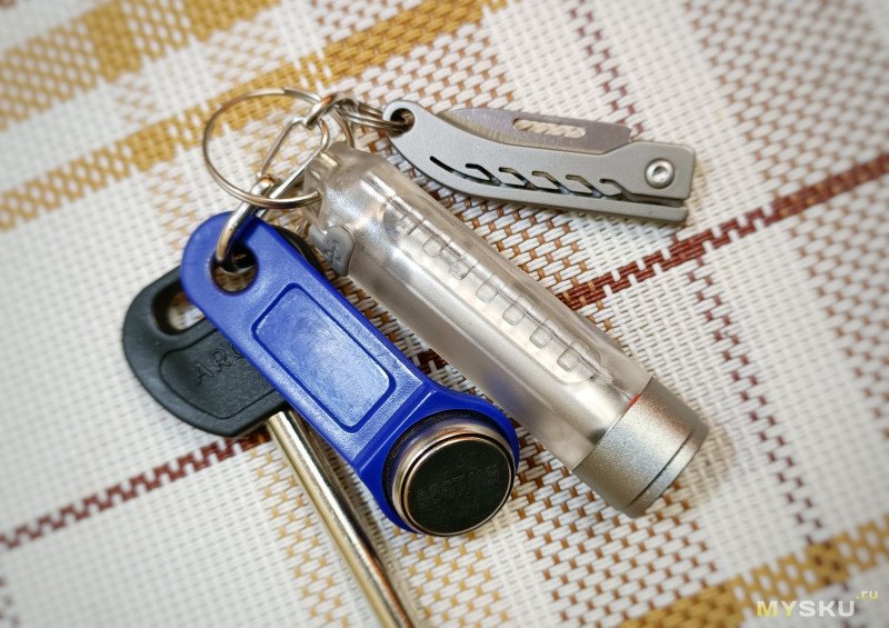 Вообще люблю минимум вещей в кармане, но пришла осень, сумерки и темно — повесил фонарик, а уж к нему и сего малыша.