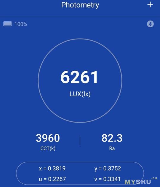 расположив люксометр ниже где-то на полтора метра по высоте и метр вбок от лампы (там было удобное стационарное место — спинка кровати, что позволяет повторить условия в будущем):
