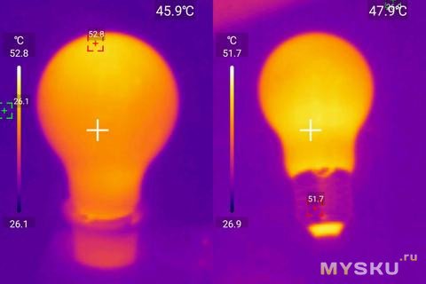 Про нагрев сказать что-то полезное сложно, ибо все спрятано внутри, колба чуть выше 50 при 25 градусах вокруг, цоколь в котором спрятан драйвер примерно столько же (немножко подстыл пока выкручивал):