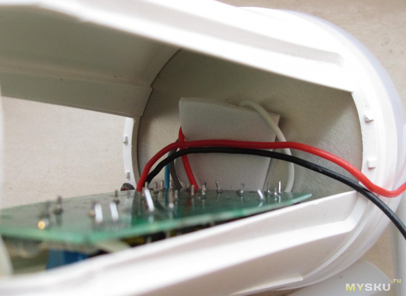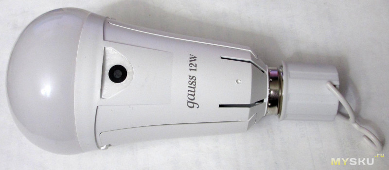 Колпак приклеен на герметик, и без труда поддевается ножом. Обратно вставляется и сам не соскакивает.Под колпаком видна конструкция — лампа на самом деле 2в1, для работы от сети и батареи две независимых цепочки светодиодов. Сетевая 24s2p, каждый корпус — 2s напряжением 5.7В, цепочки 68В.
