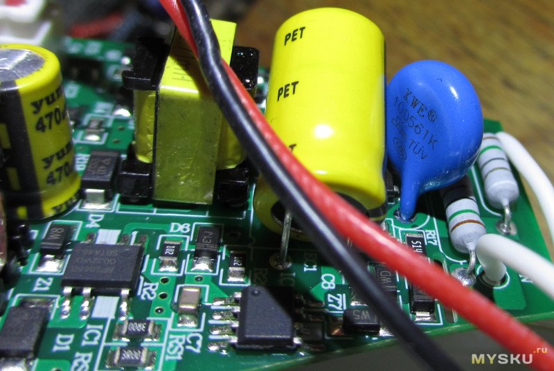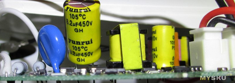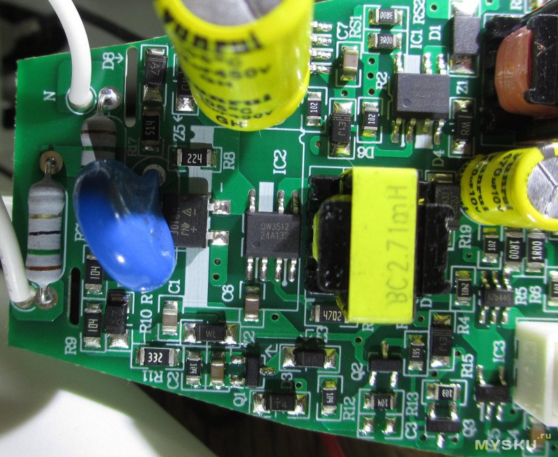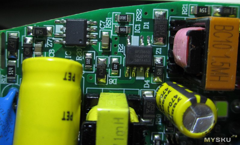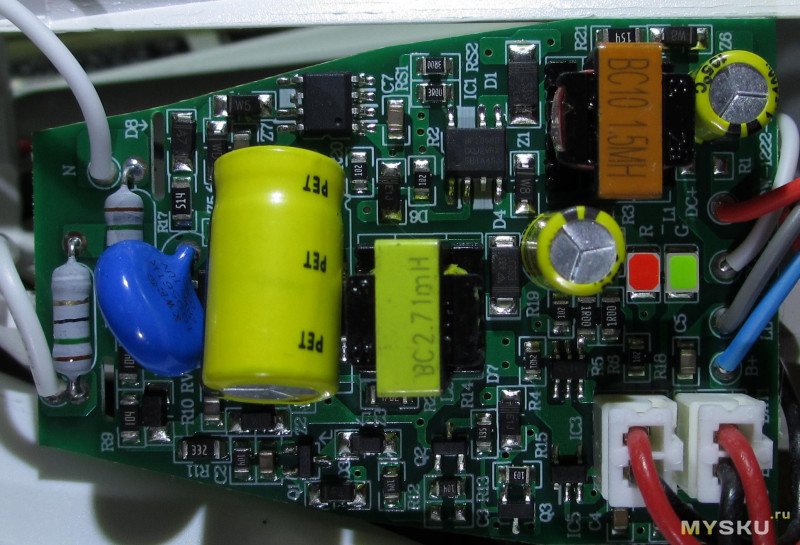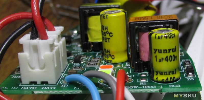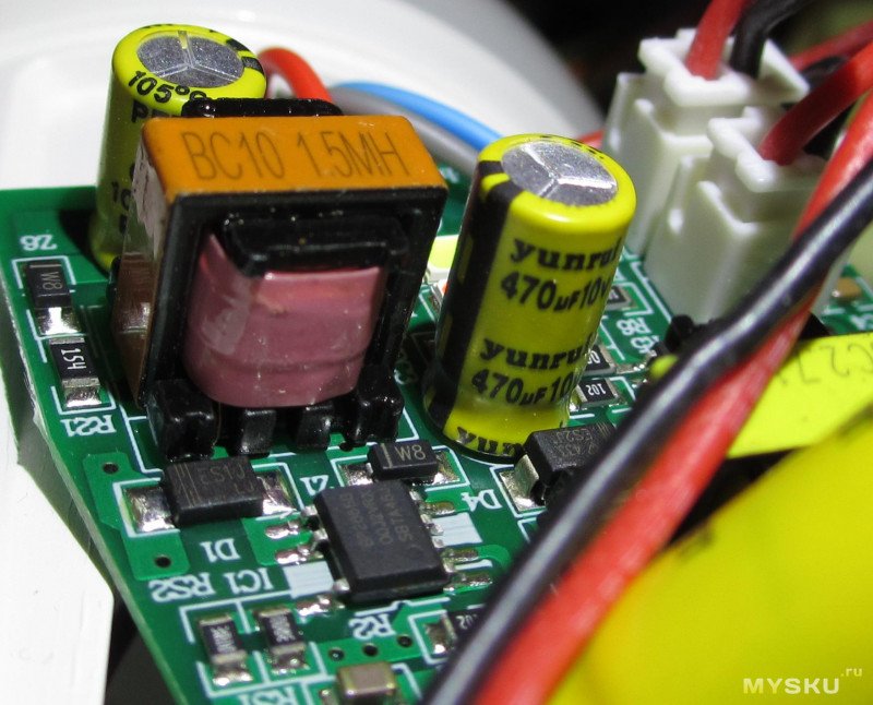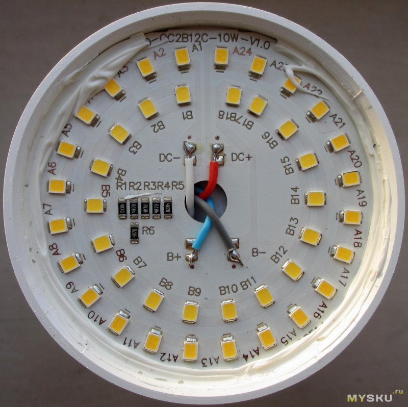 Под колпаком видна конструкция — лампа на самом деле 2в1, для работы от сети и батареи две независимых цепочки светодиодов. Сетевая 24s2p, каждый корпус — 2s напряжением 5.7В, цепочки 68В.
