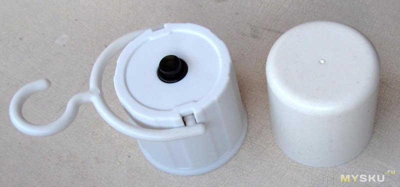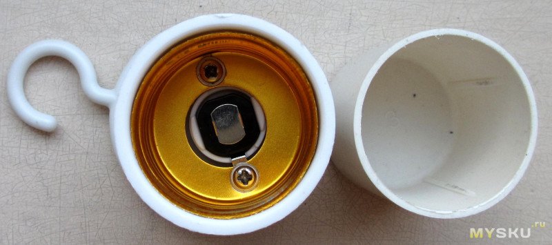 Вешалка-выключатель замыкает контакты цоколя лампы, что приводит к ее включению. Первое нажатие включает, повторное выключает, определить состояние нельзя — кнопка всегда торчит на одинаково.