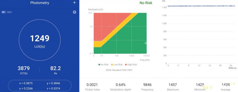 Яркость замеренная люксометром hs1010a в метре вдоль оси от сети — 160, а от полностью заряженной батареи — 55.Драйвер сетевой части импульсный, пульсации пропадают выше 100В без батареи и выше 110В при ее заряде (входной фильтр у всей схемы общий). У батарейной пульсаций нет, яркость плавно снижается по мере разряда.