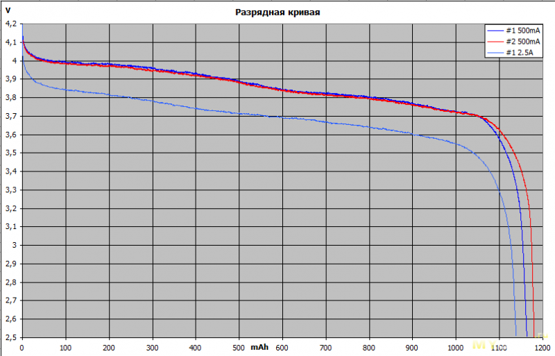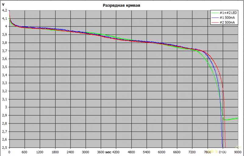 Время работы от батареи — 2ч20м, после этого лампа освещать перестала, а вот светится — нет. Переключение произошло при 2.85В, после чего оно начало повышаться. График разряда от времени (+ отдельно каждый током в пол ампера):