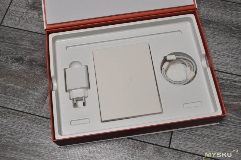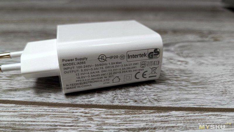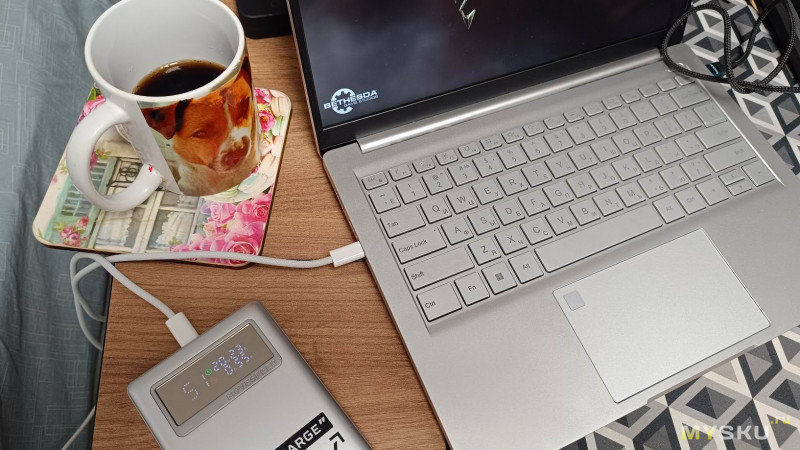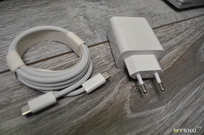 В комплекте поставляется полутораметровый зарядный кабель Type-C — Type-C в тканевой оплётке, а также компактный, напоминающий смартфонный, блок питания фирмы Intertek мощностью 65 Вт с поддержкой протокола быстрой зарядки Power Delivery. Благодаря чему можно заряжать ноутбук не только комплектным БП, но и совместимыми зарядными устройствами или даже мощными внешними аккумуляторами (павербанками) с поддержкой этой технологии.