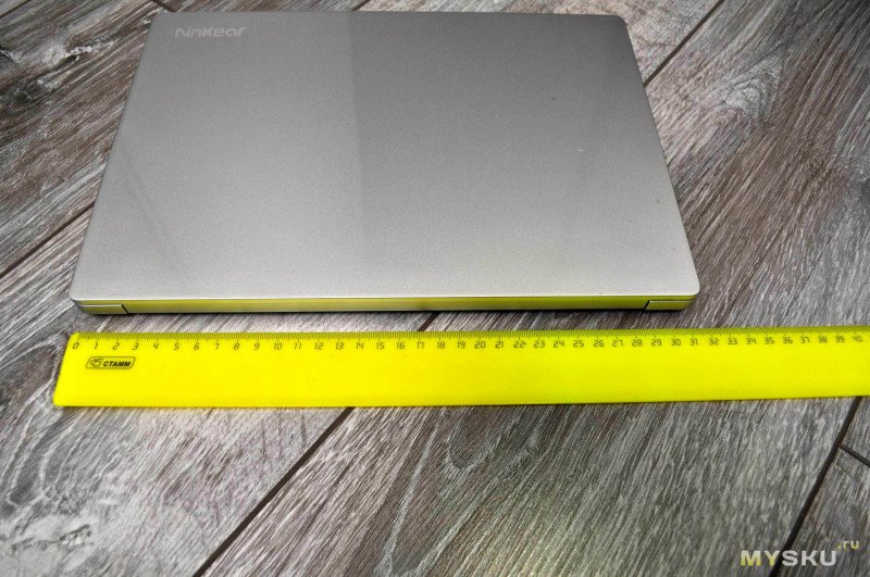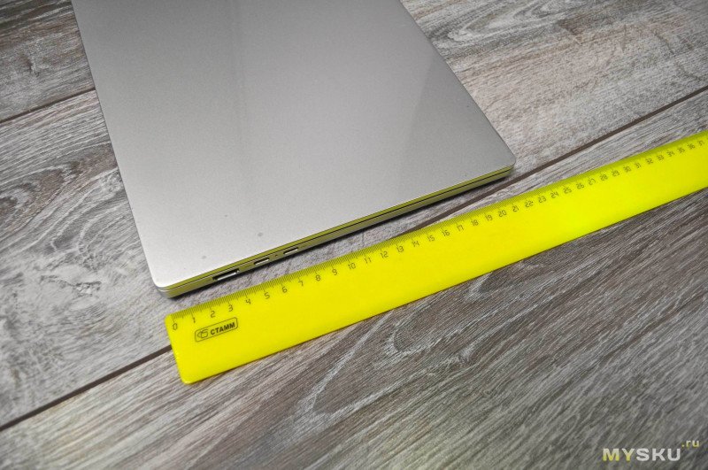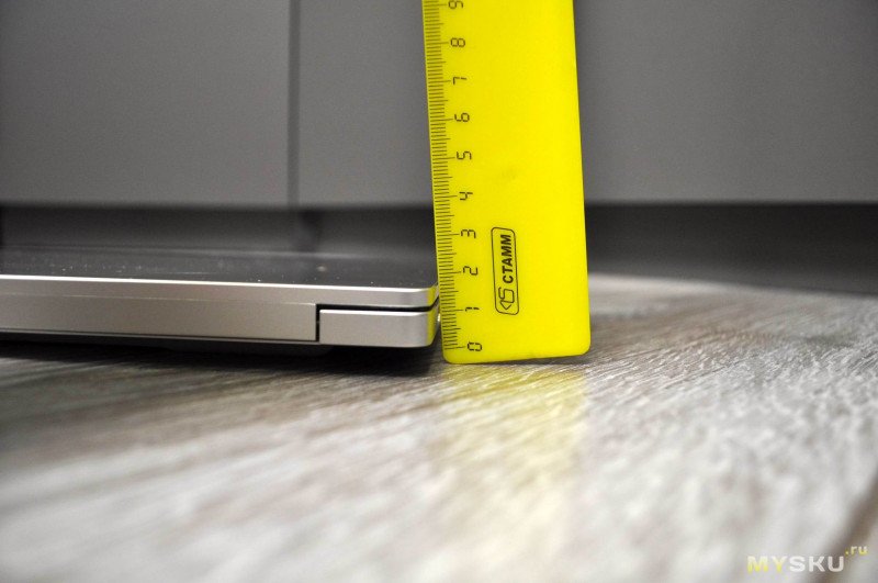 Габариты ноутбука: 312х222х20 мм. Толщина взята с учётом подставок в самой широкой части. Ближе к переднему краю она составляет всего 10 мм без учёта ножек.