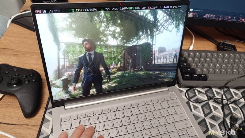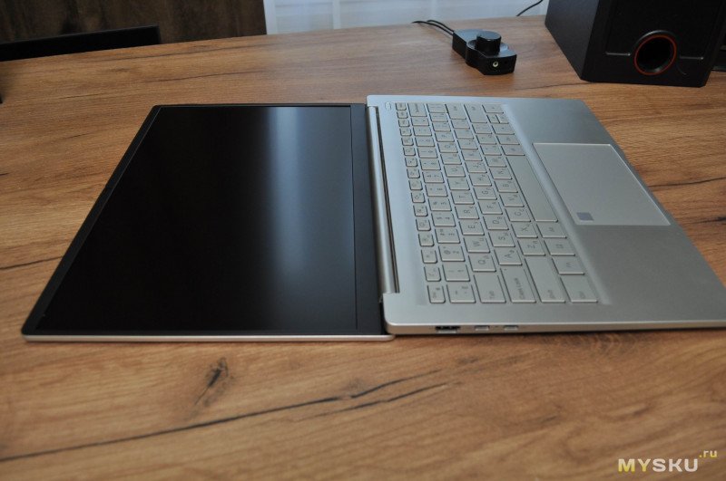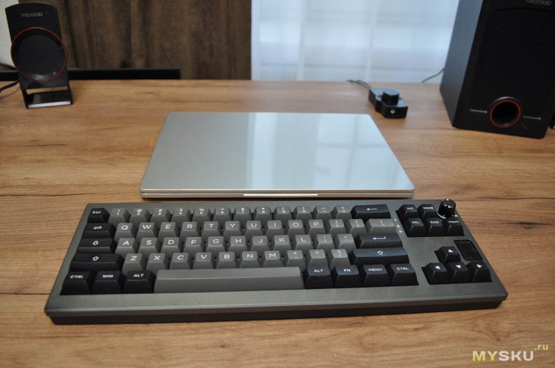 На компьютерном столе такой ноутбук займёт совсем немного места. Для визуального сравнения положил его рядом с не самой большой 70% клавиатурой.