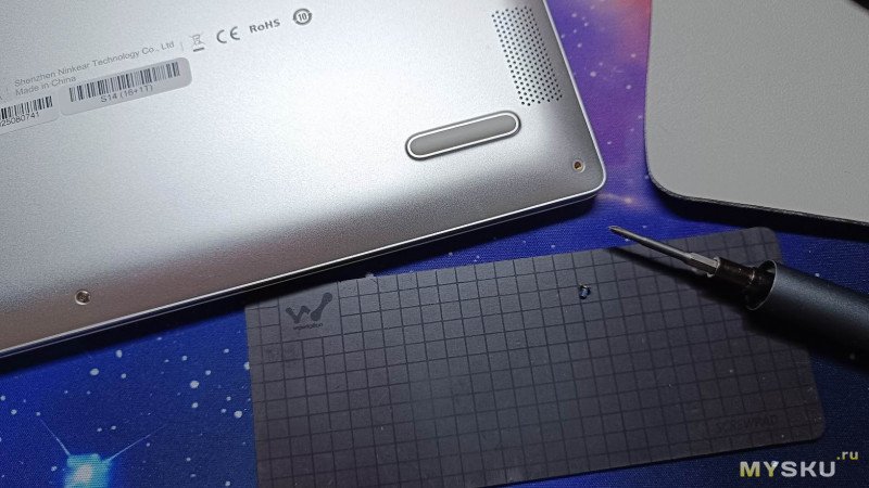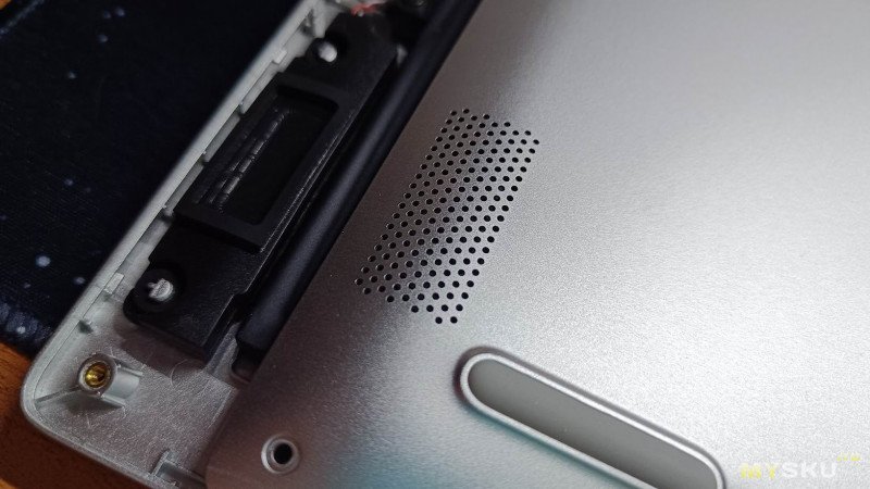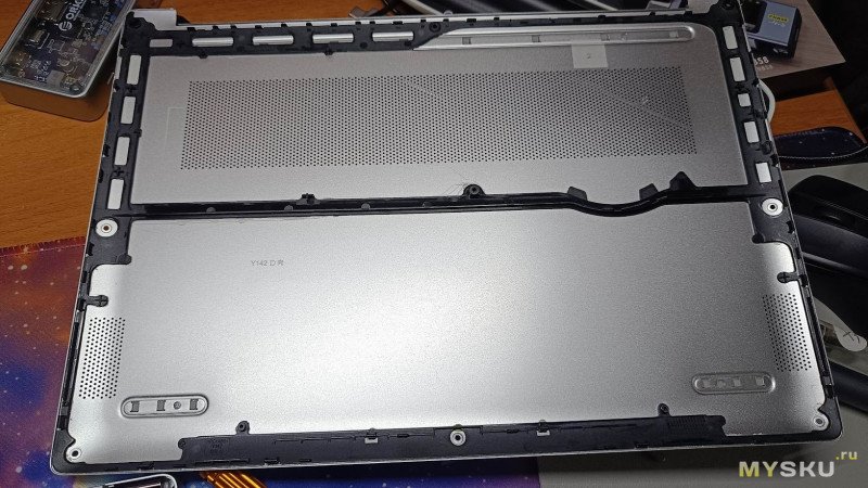 Процесс разборки относительно прост и позволяет заменить SSD или почистить систему охлаждения от пыли. Главное не поломать защёлки. Задняя крышка по периметру имеет силиконовую прокладку, видимо для гашения вибраций от работающего кулера.