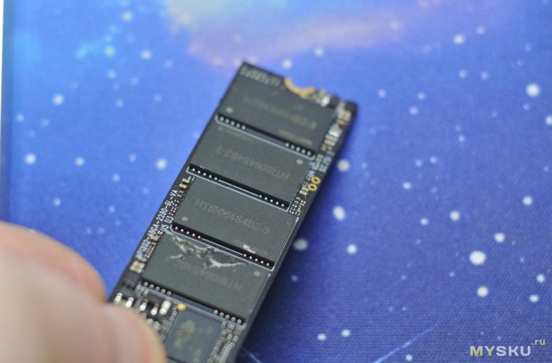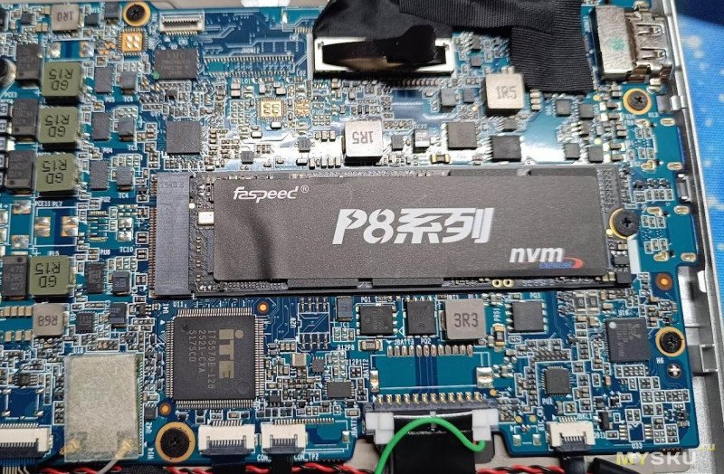 В ноутбуке имеется один слот для SSD-накопителя формата M.2 NVMe. Апгрейд также ограничен — только замена модуля, добавить второй увы не получится. Здесь стоит память фирмы Faspeed P8 Series объёмом 1 Тб. Реализована она на 4 модулях с маркировкой HT18064S4B2-3. Забегая вперёд скажу, что это достаточно быстрая память.