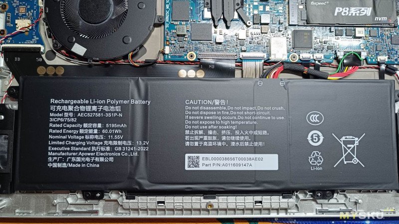 Также много места отведено под аккумуляторную батарею ёмкостью 60,01 Вт*ч или же 5195 мАч по номинальному напряжению 11,55 В. Она расположена в нижней части корпуса и занимает значительную площадь.