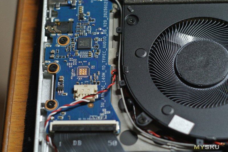 Внутри все достаточно плотно скомпоновано. Элементы на плате, шлейфы и провода оптимально расположены, ничего не торчит и не мешается. Материнская плата занимает центральную часть корпуса. Возможностей апгрейда почти нет, все элементы распаяны на плате, за исключением SSD-накопителя. Процессор AMD Ryzen 5 7535HS и встроенная графика AMD Radeon 660M находятся на одном чипе.