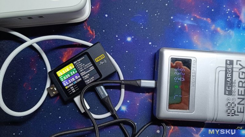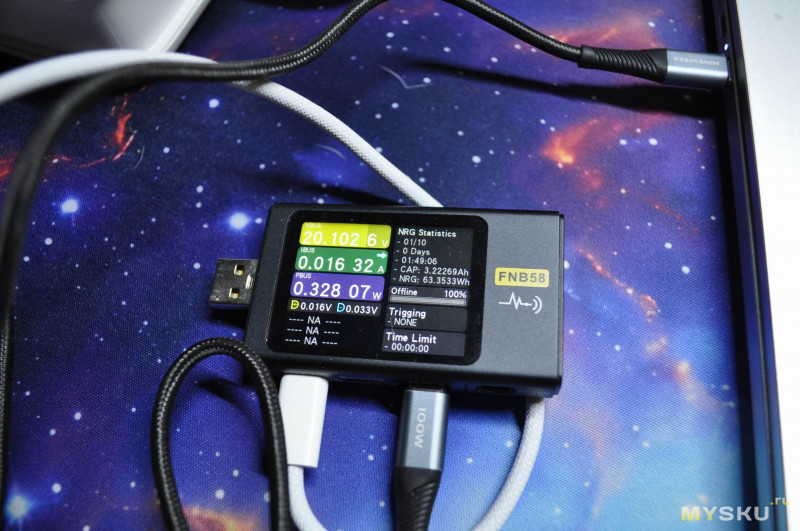 А вот с ёмкостью аккумулятора всё сошлось в точности. При зарядке тестер зафиксировал накопленную ёмкость в 63 Вт*ч, минус потери и как раз выходим на заявленные 60 Вт*ч. На полную зарядку потребовалось 1 час 49 минут.