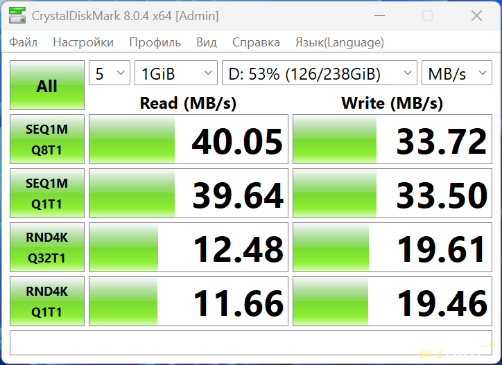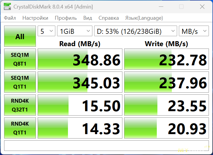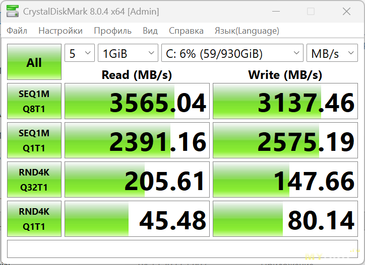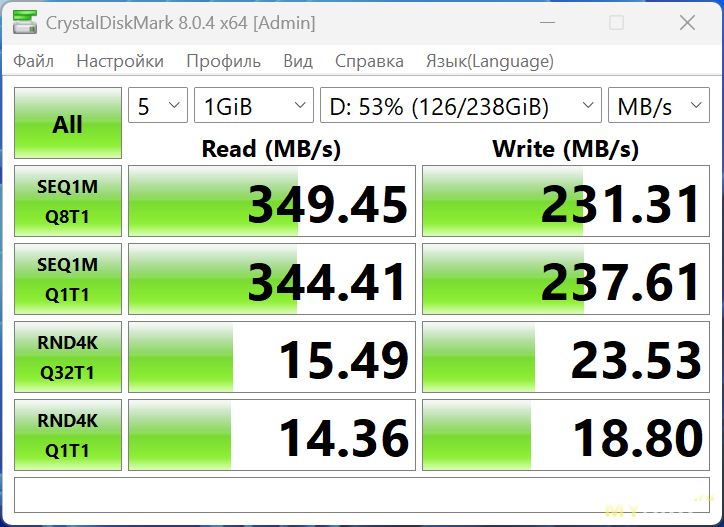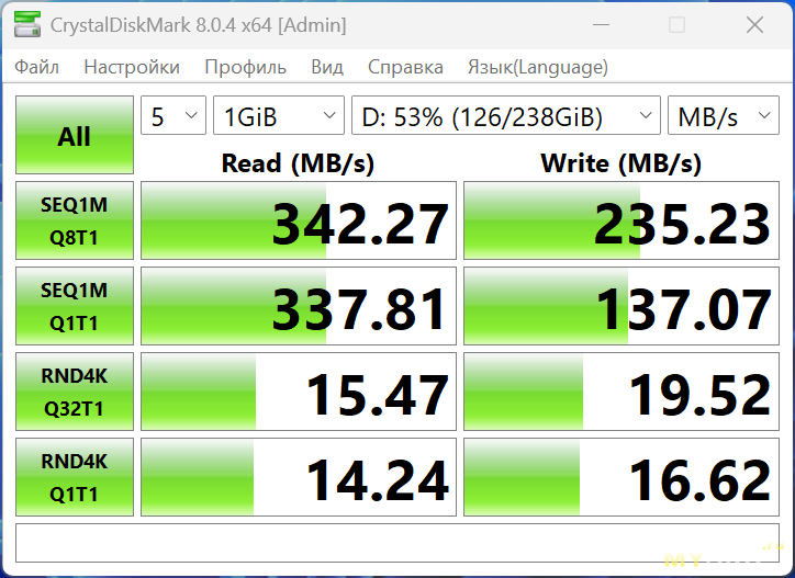 Накопитель демонстрирует весьма достойные показатели в тестах на скорость чтения/записи в программе CrystalDiskMark8.