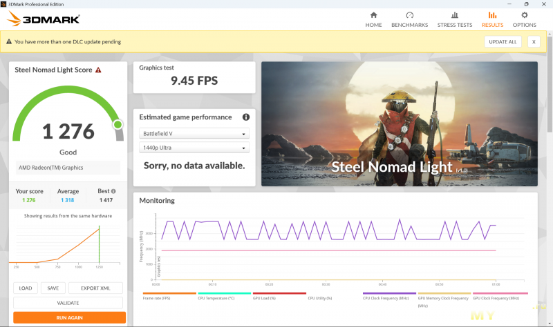 Графический бенчмарк 3DMark оценил видеовозможности ноутбука, как хорошие, поместив его результат в 1276 баллов на зелёную шкалу.