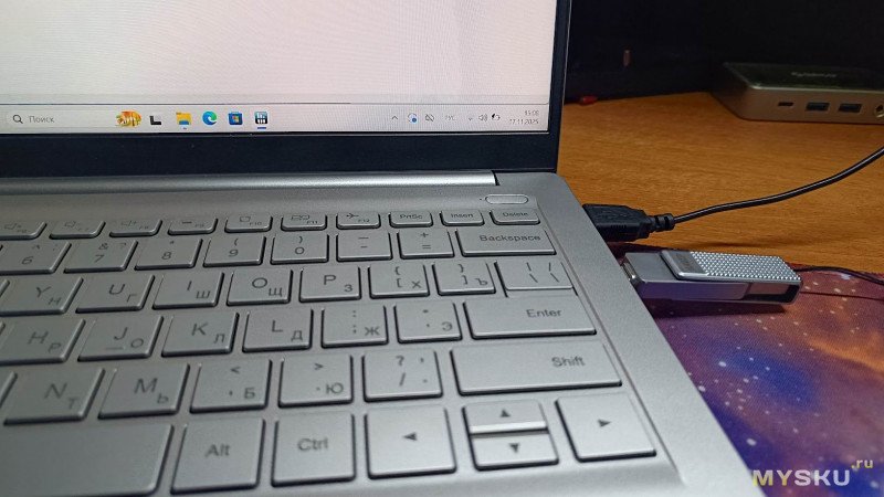 Также протестировал скоростные показатели USB и Type-C портов с помощью быстрой двухпортовой флешки ORICO USB3.2 Gen1. Два Type-C порта с левой стороны продемонстрировали максимальные скоростные характеристики накопителя.