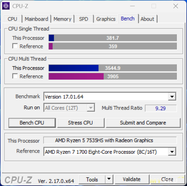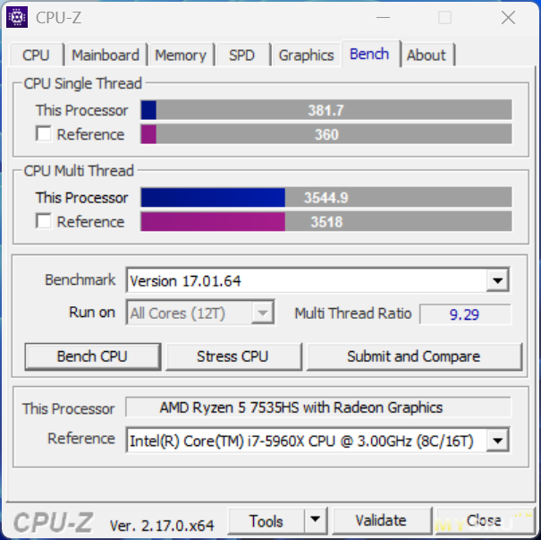 После тестирования в CPU-Z он набирает 381 балл в однопроцессорном тесте и 3545 баллов в многопроцессорном. В сравнительном анализе мощности Ryzen 5 7535HS находится между Intel Core i7-5960X и AMD Ryzen 7 1700. Первый он немного обогнал в обоих тестах, а второй обогнал лишь в однопроцессорном тесте и уступил в многопроцессорном тесте.